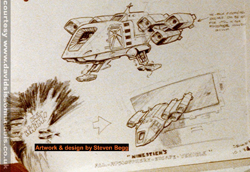 match designed by Gary Tomkins. The craft is called Hawklet but the design has the original description 'All-Atmosphere-Escape-Vehicle, and the model has 'NEV' on the top and side, possibly in the style of the MEV so it could be 'Ninestein Excursion Vehicle'? |