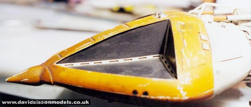 | One thing that always fooled me was that unlike the Eagle the recessed areas around the windows really are recessed creating a lip that allows space for the slotted white strips. The windows themselves are yellow translucent plastic. During filming the black areas were painted white and were returned to there original black colour afterwards. | ||